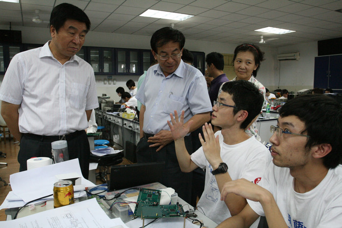 9月2日是本届电子设计竞赛的第三天,我校党委书记郭大成教授,副书记、副校长李和章教授在教务处、信息学院、自动化学院、光电学院诸位领导陪同下,亲临我校竞赛赛场,慰问参赛选手,及时关注比赛的发展动态。