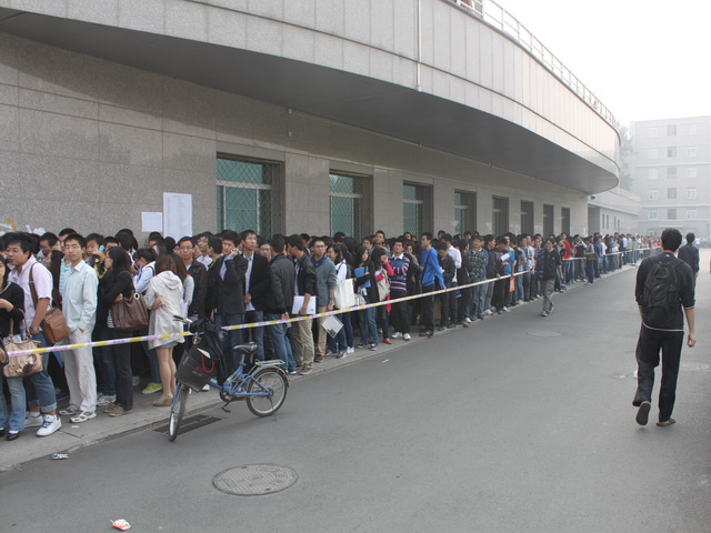在各学院、保卫处、体育部、后勤集团的大力配合下,在招生就业工作处的积极组织和妥善安排下,中国航天科技专场招聘会定于25日上午9点半开始。当日,招生就业处、各学院、保卫处、体育部、后勤集团的工作人员早早就来到现场进行准备,从6点起,热情的同学们就陆续来到体育馆门前,在保安人员的引导下,自觉排队等候。招聘会正式开始时,同学们的纵队已经长达几百米,从体育馆西门延伸至五号教学楼附近。