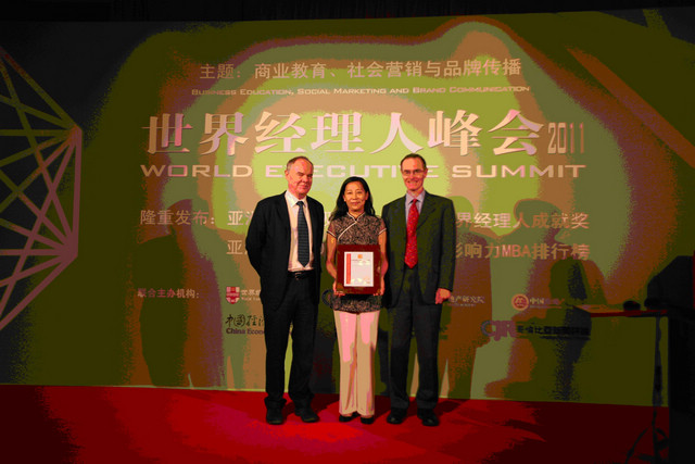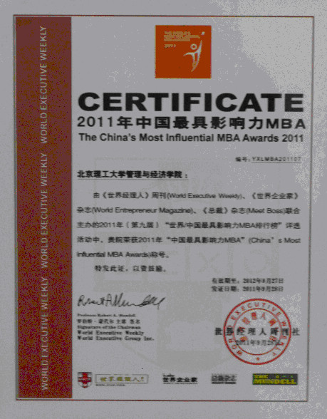《世界经理人周刊》于2011年9月28日在香港隆重发布2011“世界/中国最具影响力MBA排行榜”,我校MBA项目再次荣膺2011中国最具影响力MBA排行榜第七名。剑桥大学商学院教授、著名跨国公司和组织行为学研究专家Martin Kilduff教授和英国牛津大学商学院教授、著名营销专家Stephen Woolgar教授共同为我校代表颁发了荣誉证书。
