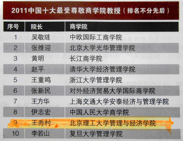 本次发布会还推出了“2011年中国十大最受尊敬商学院教授”等系列榜单。我校管理与经济学院王秀村教授被评为“2011年中国十大最受尊敬商学院教授”。