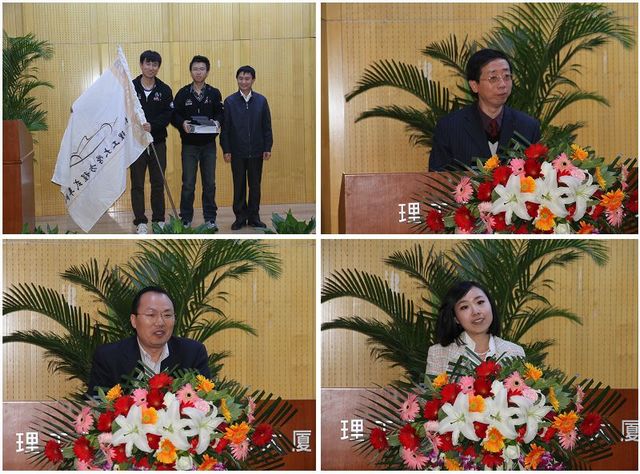 校长助理姚利民为新、老成员交接了旗帜和技术手册(左上),希望同学们能做好技术的传承,不断追逐新的进步,并同时做好文化的传承,打造一支具有鲜明特色、具有较宽辐射和具有较强实效的学生科技创新团队。蔡健先生(右上)、吴礼军先生(左下)和张洋洋女士(右下)代表企业讲话中指出,在ob真人竞猜学生身上,看到了当今青年学生追求卓越的可贵精神、不怕困难的优良品质、团结协作的团队意识和勤于动手的实践能力,学生们为学校带来荣誉的同时,也为关心、支持这支团队的企业带来了荣誉,今后还将尽自己所能,大力支持高校人才培养工作。