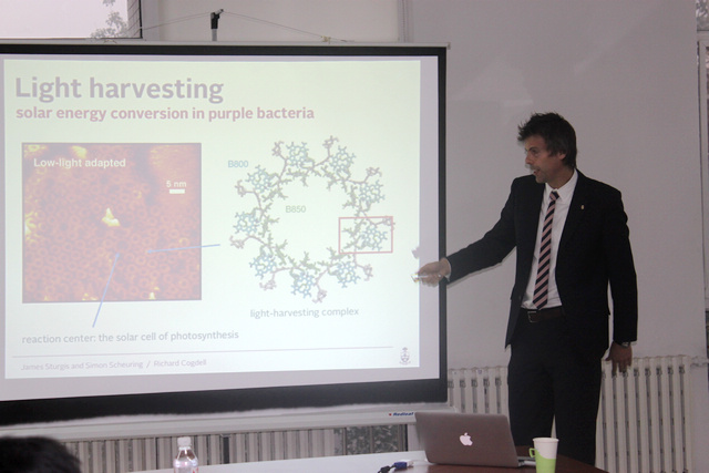聘任仪式结束后, Gregory Scholes教授为我校师生做“Lessons from Nature about Solar Light-Harvesting”的精彩学术报告,学术报告由微纳中心常务副主任邹炳锁教授主持,Scholes教授详细介绍了自然界光吸收光体系的研究进展和他在量子尺度上对其吸收过程的理解。刘颖教授、曹传宝教授、庞思平教授、董宇平教授、张小玲教授、杨盛谊教授、张加涛教授以及材料、化学等相关学院的青年教师和学生参加了本次报告, 并就相关问题与Scholes教授开展了深入的讨论。此次,Scholes 教授在我校进行为期一周的学术访问,另就“纳米晶材料研究”和“学术论文写作”为我校师生的做两次报告。