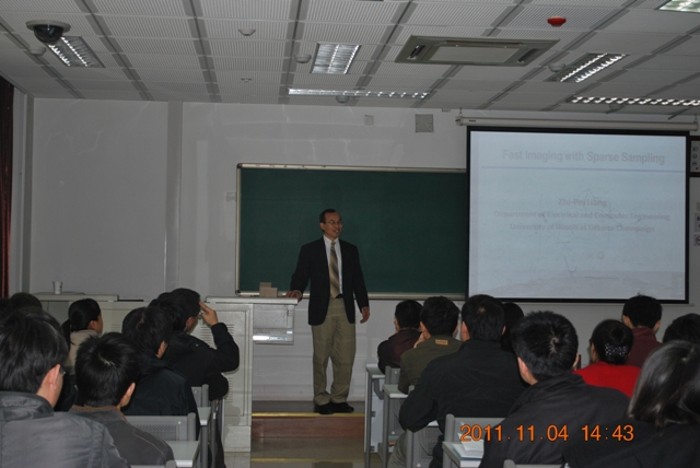 应信息与电子学院邀请,美国伊利诺伊大学香槟分校(UIUC)Zhi-Pei Liang教授于2011年11月4日下午在ob真人研究生楼411室开展了“21世纪学科前沿”学术交流活动,作了题为“Fast Imaging with Sparse Sampling”的学术报告,报告会由信息与电子学院院长龙腾教授主持,信息与电子学院数十位教师及研究生参加了此次报告会。