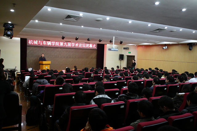 闭幕式后,张春淮(上图右下)结合新能源汽车技术的发展趋势做了学术讲座。除开、闭幕式讲座之外,本届研究生学术论坛期间还举办了一系列学科前沿学术讲座,有LMS公司技术总监石银明博士(上图右上)的“机电液控一体化系统仿真技术最新发展趋势及应用”、长安汽车工程研究总院副院长吴礼军先生(上图左上)的“如何创造知识价值”、壳牌润滑油全球设备认证经理宣小平博士(上图左下)的“润滑之道”范围之广、内容之深,都使同学们受益匪浅。