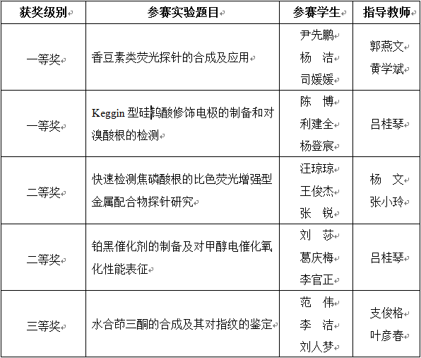 在学校教务处、校团委的大力支持下,化学学院依托化学实验教学中心和各系组织选拔和培训的五支代表队在2011年第三届北京市高校大学生化学实验竞赛中取得两项一等奖、两项二等奖、一项三等奖的优异成绩。