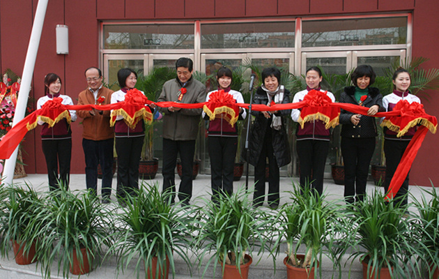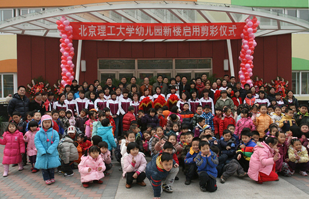 在热烈的掌声与欢呼声中,赵显利副校长、张晓红处长、杨宝玲科长以及李晋平总经理一同为幼儿园新楼剪彩。