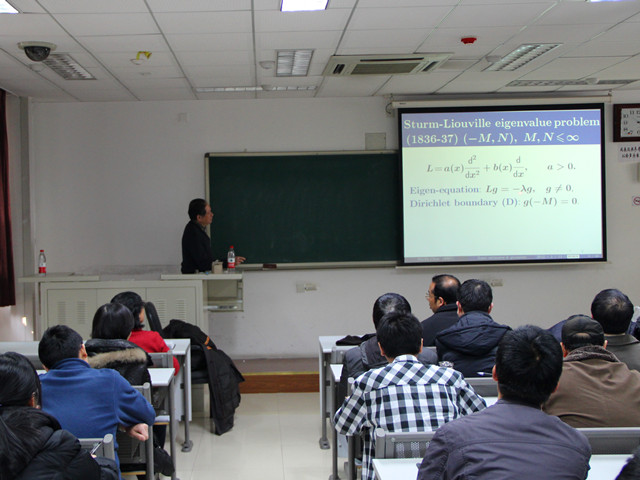 该报告中陈木法院士介绍了他最近取得的一个新成果:即对一个区间上的Sturm-Liouville特征值问题,关于两端点都是Dirichlet边界条件(DD)、两端点都是Neumann边界条件(NN),以及一端点为Dirichlet而另一端点为Neumann 边界条件(DN或ND),其主特征值大于一个由Sturm-Liouville算子的系数确定的常数而小于这个常数的4倍(可称4-factor)。历史上对DD情况P.Gurka (1989)及Opic & Kufner (1990)得到22-factor。对NN情况,用splitting技巧可得到8-factor。陈院士用非常简洁的方法证明了4-facor结果。他认为这是一个出乎他意料的一个惊人结果。然后介绍了更精密的新结果在n-维Riemannian流形中的应用。他还用数值计算(用计算机计算)画的曲线图显示了他的结果“几乎是”惊人的最佳。