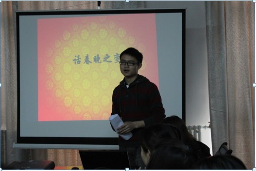 王松同学所发表话题“话春晚之变”把活动推向了高潮,其对春晚的历史、发展趋势及其意义的阐述鞭辟入里,激发了同学们的兴趣。同学们针对春晚的规模、投入等一年比一年增长,但是其中的人情味却一年比一年减少;大年30的一种娱乐方式,不必过于追求其完美等比较尖锐的问题提出了各自的观点。教学主任赵修臣副教授;辅导员钟鑫,班主任宁先进也结合自身对社会的了解,也高屋建瓴的发表了自己的看法。气氛既温馨,又热烈。谈论完春晚之变后,大家还兴致勃勃地聊起了各家乡的春节风俗。南方过节包汤圆,北方过节做饺子。有的地区过节燃篝火,有的地区过节放烟花,有的忙着祭祖,有的忙着做各种食物,各地风土人情不同,引来同学阵阵欢声笑语。