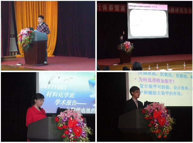 本次报告会,材料学院共邀请了韩笑(北京市民防局宣教处处长,前材料学院党委副书记副院长)、张帆(材料学院2008级硕士,现工作于世界500强-强生医疗公司)、骆雨萌(材料学院2006级本科,现材料学院2011级博士)、武金丹(材料学院2007级本科,现直博清华2011级博士)、陈萍(材料学院2009级本科,2011年国奖获得者)五名杰出报告人为同学们讲述了他们的大学青春故事。他们幽默诙谐的语言和勤奋励志的故事,赢得了同学们的阵阵掌声。报告会最后,校长助理姚利民为本次报告会作总结,他与同学们畅谈了青春的价值以及自己的大学往事,报告会在轻松的氛围中圆满结束,同学们不仅收获了关于学习的技巧,更启发了对人生和青春的思考。