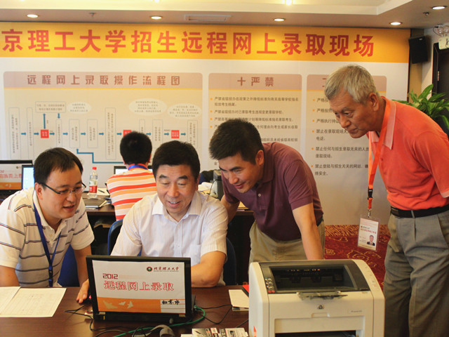 郭大成书记来到录取现场后,听取了李振键处长关于近期招生录取工作进展情况的汇报,并查看了《招生就业工作处简报——录取进行时》等资料。为深入实施“阳光工程”,确保招生录取公平、公正的进行,让考生、家长、社会满意,我校按照工信部、教育部、北京市等上级部门关于高校录取的文件精神要求,在录取期间对录取场所实行封闭管理,以避免外界干扰,提高工作效率。全体招生录取组均为通过培训和考试选拔出来的政治强、业务精、纪律严、作风正的同志组成,本着“一切为考生服务”的根本宗旨,以周到、热情、严谨、人性化的理念开展招生录取工作。