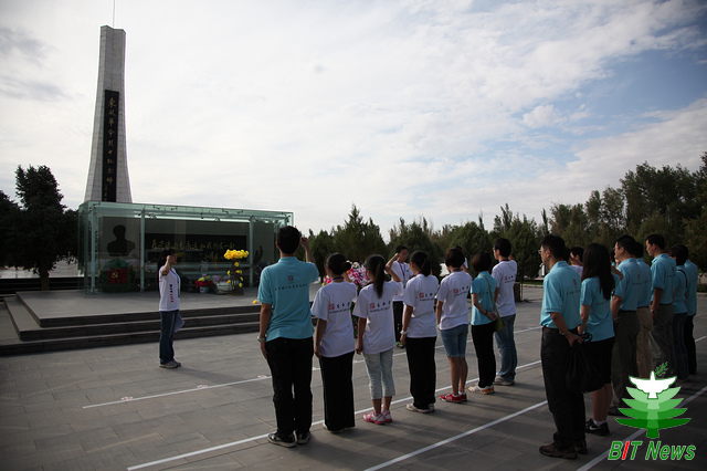 在东风革命烈士陵园,烈士陵园始建于二十世纪六十年代初,占地约3万平方米,有七百余名官兵、职工和家属长眠在这里。队员们在东风革命烈士纪念碑前庄严宣誓、进献花篮并进行了祭扫活动。队员们怀着肃穆的心情清扫墓碑,深刻缅怀革命先烈,对那些为航天事业奉献生命的前辈们表达了崇敬之情。随后队员们在蒲有珠参谋的带领下又来到了航天史展览馆,展览馆以历史时间为主线,通过珍贵的历史实物、记录照片、仿真模型的展列以及讲解员的认真介绍,将五十多年以来我国导弹、卫星事业的发展历程展现在全体队员面前。特别是在航天城初建时期展览区,战士们搏击风沙、建设基地的图片和众多的英雄事迹让大家感受到了“特别能吃苦,特别能攻关,特别能战斗,特别能奉献”的载人航天精神。