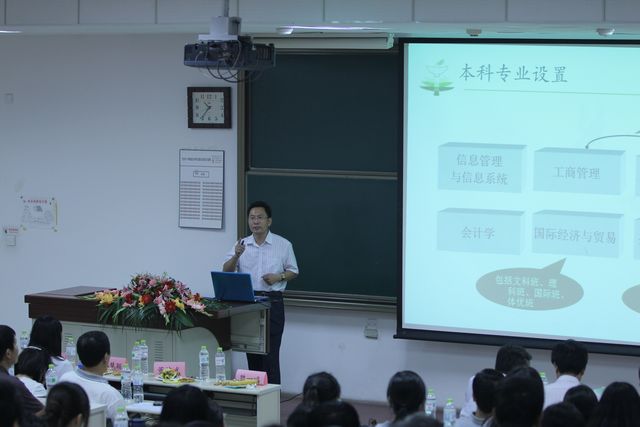 接下来,管理与经济学院副院长董沛武就管院本科生培养与成长向新生及家长做了详细的介绍和讲述。然后,管院各系主任分别向新生及家长介绍了各专业学科的基本情况。 其中,高慧颖、倪跃峰、张丽红、陈宋生、马明,五位老师分别就信息管理与信息系统、市场营销、工商管理、会计、国际经济与贸易5个专业进行了特色鲜明的专业介绍。老师们分别从本专业的历史、师资科研、培养方案、实践学习、毕业方向等方面向新生及家长做了详细的讲解和介绍,从而使新生及家长们对所选专业有更深一步的了解和认识。
