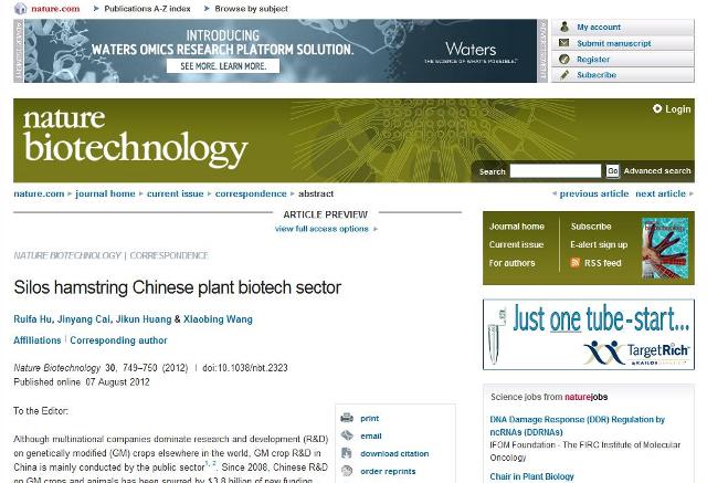 Ruifa Hu, Jinyang Cai, Jikun Huang, Xiaobing Wang. “Silos hamstring Chinese plant biotech sector” Nature Biotechnology, 2012, 30(8):749-750 doi: 10.1038/nbt.2323.