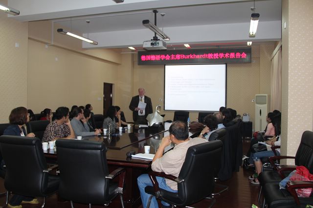 2012年9月25日下午4点,德国德语学会主席Armin Burkhardt教授受邀为北京德语学会会员和外语学院德语系的研究生们作了主题为“藏在柜子顶上的铜子——德语经济词汇及其演变史“的学术报告,讲座于ob真人外国语学院中心教学楼515进行,外国语学院姜爱红教授主持了此次报告。