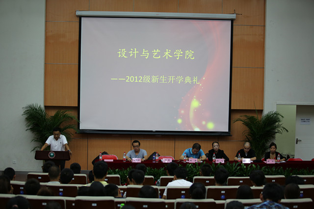 9月26日晚七点,设计与艺术学院2012级新生开学典礼在良乡校区隆重举行。设计与艺术学院党委副书记、副院长孙飞,副院长姬勇,院长助理、视觉传达系程九军,环境艺术系教授庄虹,传统工艺美术系主任王乐耕,造型艺术系主任周岩,文化遗产系主任于小川以及2012级全体新生参加了本次典礼。