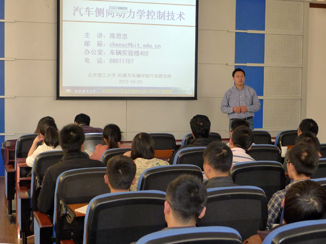 汽车研究所陈思忠教授作“汽车侧向动力学控制技术”报告,主要以汽车侧向动力学控制为着眼点,针对当代汽车先进底盘新技术、新结构及其控制特征进行详细分析和研讨,内容新颖,吸引车辆系师生四十余人参加。