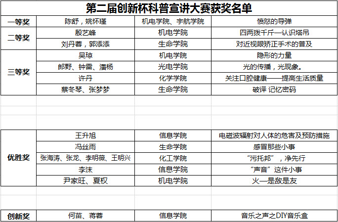 经过初试的选拔,复赛的磨练,最终留下的七名选手为我们呈上科普盛宴。从科技前沿到生活常识、从军事方寸到环境解密,选手们运用幽默风趣的语言,深入浅出的讲解将五彩斑斓的科学世界展示给我们,让在场的评委和观众获益匪浅。1号选手,来自光电学院的郎野、钟雷和潘杨等同学亲力亲为制作了3D原理仪,向我们揭示了3D影像的奥秘;2号选手,来自生命学院的蔡冬琴与张梦梦同学活泼可爱带领我们探讨大脑的神奇;3号选手,来自机电与宇航学院的陈舒与姚怀瑾同学寓教于玩,从愤怒的小鸟出发展现导弹“调皮”的一面;4号选手,来自机电学院的殷艺峰同学亲自搭建塔吊,细致展示塔吊的秘密;5号选手,来自机电学院的吴琼同学带来了一系列丰富的小实验揭秘大气压的神秘;6号选手,来自化学学院的许丹同学立足生活,告诉我们如何爱护牙齿;7号选手,来自生命学院的刘丹蓉与郭添添同学扎根青少年,讲述近视手术的原理。选手们强劲的实力、对科技详尽的理解、优秀的讲台魅力,无一不赢得观众们的心,阵阵掌声便是对选手们最大的肯定。