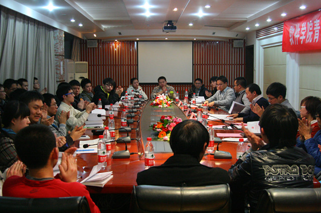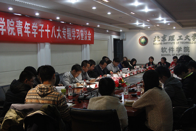 2012年11月27日,软件学院青年学子十八大专题学习座谈会在软件楼208会议室召开。学生处副处长徐建老师、全国青联委员王树良教授、软件学院团委书记陈杰浩老师、各年级辅导员以及青年学生代表参加了本次学习座谈会。会议由陈杰浩老师主持。