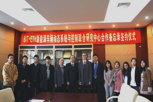 2012年11月26日,BIT-ETH新能源车辆动态系统与控制联合研究中心签约仪式在我校举行。该签约仪式是继今年十月份,我校党委书记郭大成教授率领我校代表团访问瑞士联邦苏黎世理工大学(ETH)之后,双方达成合作意向的后继举措。郭大成书记亲切会见了瑞士联邦苏黎世理工大学动态系统与控制研究所副所长Christopher Onder博士,并希望两校以BIT-ETH新能源车辆动态系统与控制联合研究中心签约为契机,促成更多学科之间、更多教授之间的实质性科研合作。机械与车辆学院副院长姜澜教授、车辆工程系副主任邹渊副教授参加了会见。