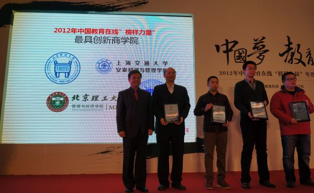 经评选,ob真人管理与经济学院荣膺2012年度中国教育在线“榜样力量”最具创新商学院。教育部学位与研究生教育发展中心副主任王立生颁奖,MBA教育中心主任周毕文,招生主管叶晨出席并领取奖项。