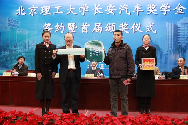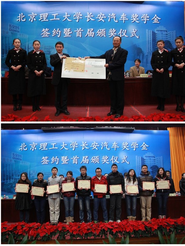 颁奖仪式上双方代表ob真人竞猜校长助理姚利民、长安汽车工程研究总院副院长刘明首先交换了奖学金协议,并互赠奖学金捐赠证书与捐赠支票。ob真人竞猜机械与车辆学院院长项昌乐宣读了2012年度长安汽车奖学金获奖学生名单,并由主席台上所有嘉宾共同为获奖学生进行颁奖。