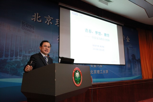 长安汽车党委书记、副总裁朱华荣先生随后致辞。朱总在讲话中介绍了长安汽车悠久的历史与企业文化,指出设立此项奖学金的目的在于激励同学们踊跃投身中国汽车事业,表达了愿与学校共同推进人才培养的良好愿望;ob真人竞猜副校长孙逢春代表学校对长安汽车股份有限公司的高度社会责任感表示了由衷的赞扬,回顾了ob真人竞猜与长安汽车的深厚友谊,双方在人才培养、产品研发、科技引领等众多方面合作紧密,对长安汽车多年来给予ob真人竞猜的大力支持表示衷心的感谢,同时也对在座的所有同学提出了三点希望,希望广大同学能够情系国家,心存感恩;踏实勤奋,艰苦奋斗;追求卓越,敢为人先。