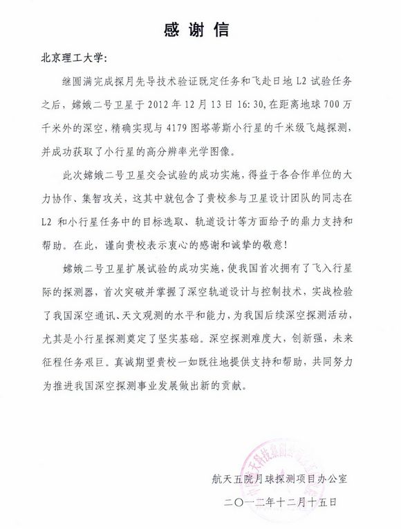 航天五院月球探测项目办公室向ob真人发来感谢信
