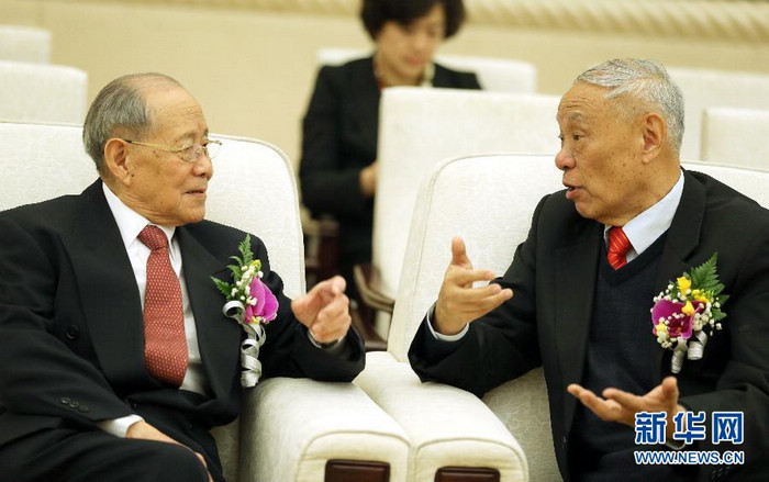. 1月18日,国家科学技术奖励大会在北京人民大会堂举行,郑哲敏院士、王小谟院士获得2012年度国家最高科学技术奖。这是郑哲敏院士(左)与王小谟院士当日在人民大会堂交谈。新华社记者鞠鹏摄