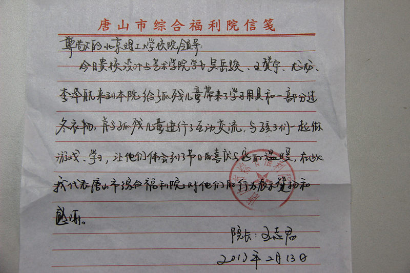 “有我更精彩”社会实践团走进唐山市综合儿童福利院看望孤残儿童。他们用平时节省下来生活费购置了文具、衣物、儿童玩具,并与孤残儿童进行了互动交流,与孩子们一起学习、游戏。随后实践团成员结合自己的专业特长给他们上了一堂生动、活泼的美术绘画课,课上欢声笑语不断,让孩子们体会到了节日的喜庆和家的温暖。唐山电视台对本次实践活动进行了全程跟踪报道,活动也得到了当地政府和福利院的高度评价与肯定。
