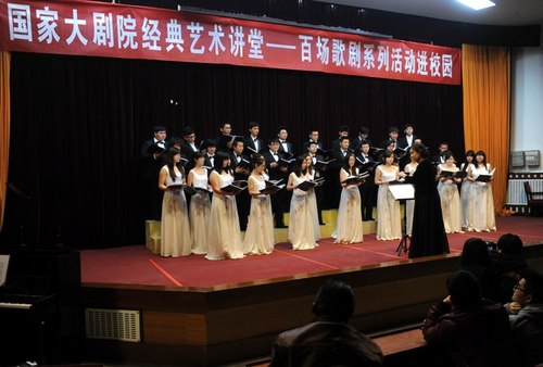 多年从事歌剧事业,聊起“歌剧”,戴玉强自然毫不“怯场”,从西方歌剧经典到中国原创歌剧讲述歌剧的发展和风格,探讨歌剧在中国的发展,从歌剧音乐、演唱表演、歌剧序曲、咏叹调、宣叙调基本结构介绍歌剧知识,从大剧院原创歌剧《西施》到今年的大戏《纳布科》讲解大剧院歌剧节剧目亮点,从歌剧制作、导演编剧到排练花絮讲述自己参演大剧院制作的幕后故事,健谈的戴玉强还时不时穿插讲个小故事,并示范演唱《西施》“影子之歌”、《图兰朵》“今夜无人入睡”等曲目。而结合戴老师的授课,国家大剧院管弦乐团弦乐四重奏乐团,现场演奏了《茶花女》当中的《饮酒歌》、《罗恩格林》选段《婚礼进行曲》等歌剧经典曲目,风趣的讲解、优美的乐曲,学生们想开小差都不行。