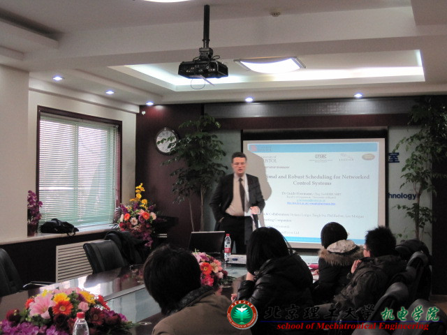 Dr Guido Herrmann通过两次学术报告“Optimal and Robust Scheduling for Networked Control Systems”以及“Novel Adaptive Algorithms for Control and Estimation”为我校师生介绍了近两年的学术研究进展与成果。 Dr. Guido Herrmann在ob真人访问期间主要展示了两个他的研究方向,首先是网络化控制系统(NCS)。它的优势在于能够将大型的复杂控制系统通过分布式控制单元加以实现。Dr. Guido Herrmann在该领域内的研究从控制的角度讨论NCS特性的理论分析方法,应用鲁棒控制理论及NCS分析工具对线性及非线性NCS进行了深入的探索,同时也兼顾到系统的工程实现问题。该方法在工程上可用于处理时间触发通信类型的NCS问题,例如应用于汽车控制网络的FlexRay协议,或是在航天领域内有所应用的AFDX网络。此外,他的研究兴趣还包括了对鲁棒自适应算法的研究。其主要应用领域为飞机、汽车、机器人以及其他类型的分布式控制系统。