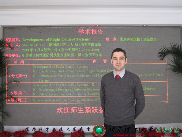 德国慕尼黑工大飞行动力学研究所在导航系统设计、飞行系统模型辨识技术、多飞行旗编队协同技术以及集成制导与控制技术等方面均取得了显著的成果。访问期间,Stanislav Braun博士为我校的广大师生开展了三次系列讲座,比较系统的讲授了飞行控制系统设计的过程、飞行控制仿真技术,并从飞行控制角度介绍了系统安全评价方法与技术。