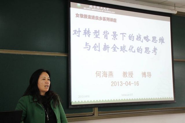2013年4月16日下午2点,何海燕教授在良乡校区理教207教室进行了题为“对转型背景下的战略思维与创新全球化的思考”的讲座,对同学们在专业以及未来职业方向上的困惑进行了精彩的解答。