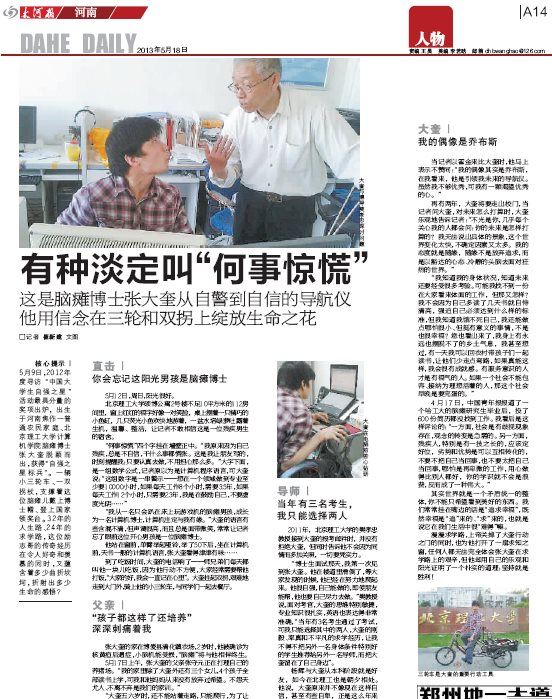 “博士生面试那天,我第一次见到张大奎。他在楼道里滑倒了,等大家发现的时候,他已经在努力地爬起来。他很自强,自己能做的,即使朋友能帮,他也要自己尽力去做。”樊教授说,面对考官,大奎的思维特别敏捷,专业知识很扎实,英语也表达得非常准确, “当年有3名考生通过了考试,可我只能选择其中的两人,大奎的刚毅、率真和不平凡的求学经历,让我不得不把另外一名身体条件特别好的学生推荐给另外一名导师,而把大奎留在了自己身边”。