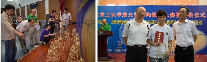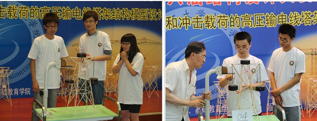 此次大赛的题目为承受静载和冲击载荷的高压输电塔架结构模型设计,要求参赛选手用桐木和乳胶两种材料设计、制作一个高600mm的塔架模型。进入决赛的20组选手带来了各自精心设计、制作的塔架模型。决赛中选手首先进行静态加载:在塔架顶端放置20牛顿的砝码,其次在一侧悬臂悬挂30牛顿的砝码,再在另一侧悬臂悬挂10牛顿砝码;然后进行冲击加载:在两侧悬臂各悬挂20牛顿砝码,其中一侧悬臂的10牛顿砝码提升120mm后,突然释放对塔架形成冲击载荷。加载完成后模型没有损坏,且质量轻者获得优胜。通过紧张激烈的比赛,最后决出了获得模型承载能力优胜奖的7组选手以及获得 “最佳造型奖”、“最佳制作奖”、和“功败垂成奖”的3组选手。