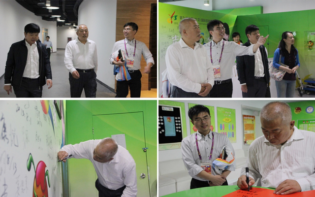 慰问结束之后,李校长受邀参观了位于主场馆二楼的志愿者之家。刚步入房间,房间里的志愿者起立并鼓掌欢迎,李和章副书记随即微笑着示意向大家问好。在志愿者之家里,片区负责人详细介绍了志愿者之家的功能和文化特色,并邀请李和章副书记在签名墙和嘉宾题词簿中签名留念。