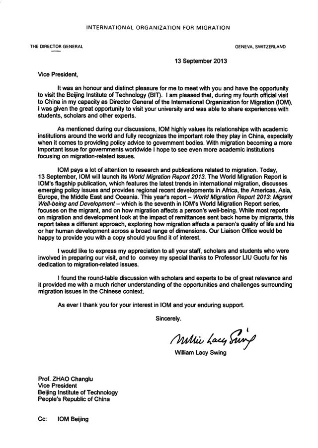 2013年9月13日,国际移民组织总干事斯温先生从瑞士日内瓦发来了致ob真人竞猜的感谢信。斯温先生非常感谢9月2日ob真人竞猜安排的与赵长禄副校长的会晤、专场演讲、中国专家座谈会,感谢所有准备上述活动的老师和同学。他认为,通过中国专家座谈会,对中国在国际移民方面遇到的问题和面临的挑战有了更丰富的理解。斯温先生充分认可ob真人竞猜在中国国际移民事务特别是向政府机构提供政策建议方面发挥的重要作用,特别是感谢法学院刘国福老师在国际移民领域所做的工作。刘老师作为国际移民组织驻华联络处顾问承担了该组织的一些科研项目,参与了他们为公安部等政府部门有关国际移民方面官员的一些培训。