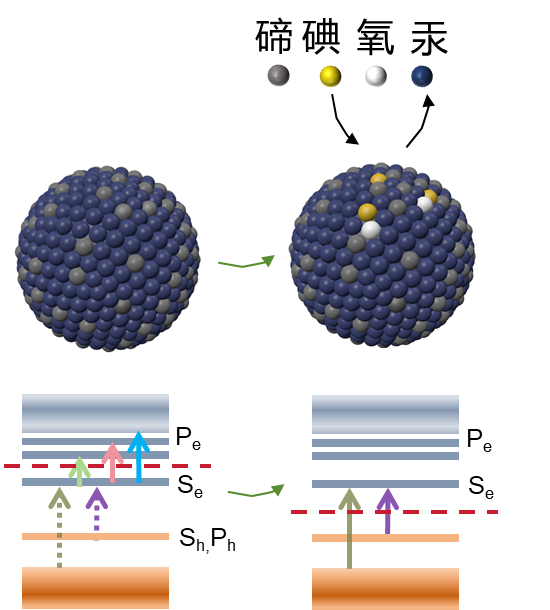 本工作通过薄膜场效应管及双电位电化学实验探明了极限尺寸红外量子点光电探测性能的主要限制是光生载流子漂移长度与传输通道长度相比较短。针对该难点,研究组在前期配体交换(Nature Materials 2020, 19, 323–329. https://doi.org/10.1038/s41563-019-0582-2)及表面偶极子掺杂调控(Light: Science & Applications 2023, 12 , 2,https://doi.org/10.1038/s41377-022-01014-0)工作的基础之上,提出了碘离子配体修饰方法(如图3所示),钝化量子点的富金属表面,实现掺杂精准调控。