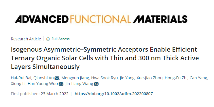 近日,ob真人竞猜王金亮教授团队在构筑高效三元有机太阳能电池方面取得进展,相关研究成果发表于国际材料领域著名学术期刊《Advanced Functional Materials》上,题为“Isogenous Asymmetric-Symmetric Acceptors Enable Efficient Ternary Organic Solar Cells with Thin and 300 nm Thick Active Layers Simultaneously”。化学与化工学院博士研究生白海瑞为论文第一作者,王金亮教授、安桥石特别研究员以及Han Young Woo教授(韩国高丽大学)为通讯作者,ob真人竞猜为第一通讯单位。论文的合作者还包括北京工商大学李熊教授。
