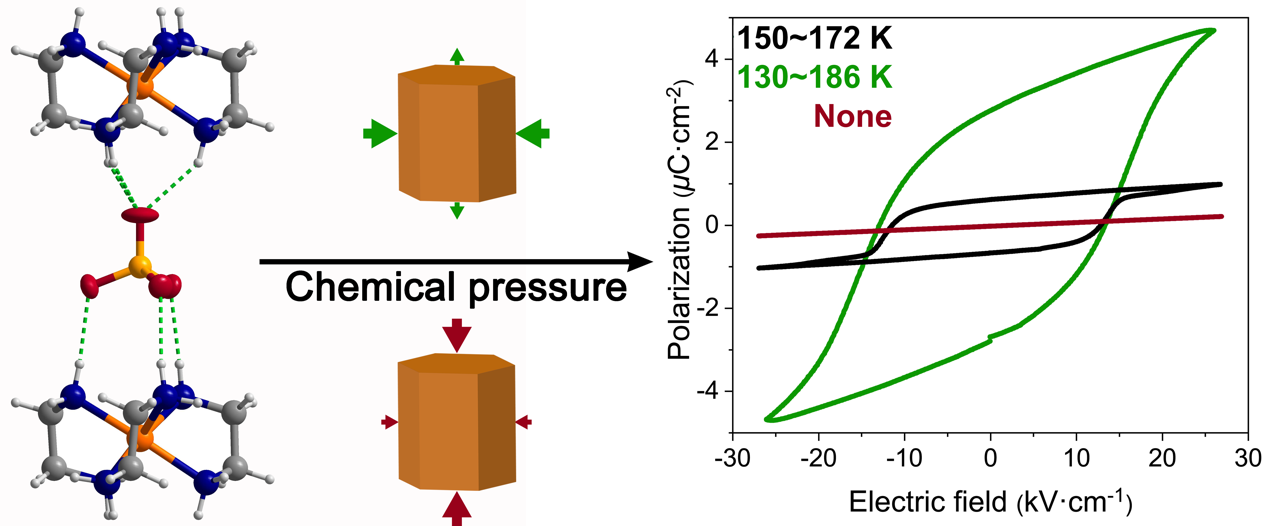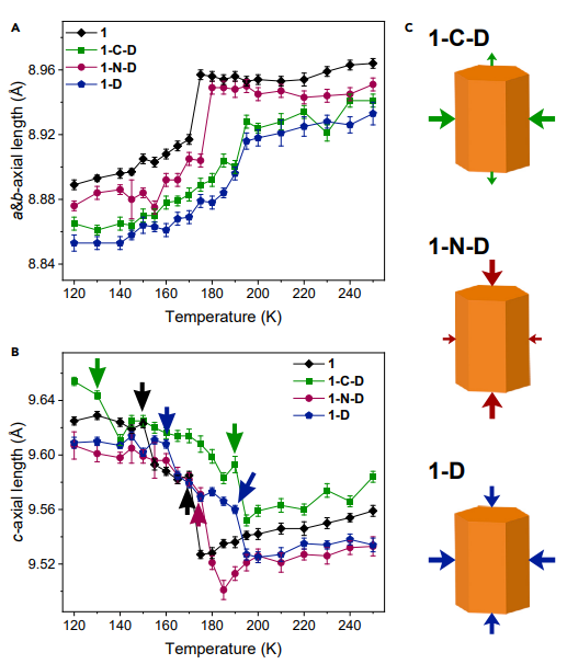 该研究团队在前期通过结构变化调控材料物理性质的研究基础( Nat. C hem., 2014 , 6, 1079-1083 ; Nat. Commun. 2019, 10 , 4805; CCS Chem. 2021, 2, 2464–2472; Nat. Commun. 2021, 12 , 6908; Angew. Chem. Int. Ed. 2023, 62, e202217977; J. Am. Chem. Soc. 2023, 145, 5545-5552),针对单晶晶格各向异性的结构特征,提出选择性氘代引入各向异性化学压力的研究思路,通过对具有三方晶系的硫酸三乙二胺合钴铁电化合物进行选择性氘代,在弱氢键功能材料中实现了显著的氘代效应。当对C-H原子氘代时铁电窗口温度从22 K提高到了56 K,自发极化值也增大4倍,而当对N-H原子氘代时,铁电性质完全消失。通过变温晶胞参数、倒异空间分析、介电温谱、电滞回线、以及理论计算等对该现象进行了深入的研究。