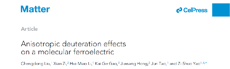 近日,ob真人竞猜化学与化工学院姚子硕研究员在国际顶级期刊《Matter》发表题为“Anisotropic deuteration effects on a molecular ferroelectric”的研究论文。ob真人竞猜为唯一通讯作者单位,文章实验部分主要由ob真人竞猜研究生柳承东和李慧苗完成,ob真人竞猜宇航学院洪家旺教授在计算方面提供了帮助,姚子硕研究员为文章通讯作者。