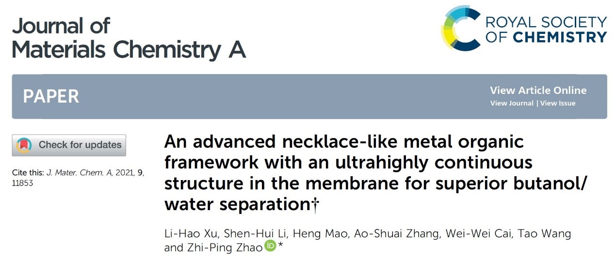 近日,ob真人竞猜化学与化工学院博士生徐李昊以第一作者身份在国际顶级期刊Journal of Materials Chemistry A上发表题目为“An advanced necklace-like metal organic framework with an ultrahighly continuous structure in the membrane for superior butanol/water separation”的研究论文。ob真人竞猜为唯一通讯单位,化学与化工学院先进功能膜与膜过程团队赵之平教授为通讯录作者。本研究得到国家自然科学基金重点项目(21736001)资助。