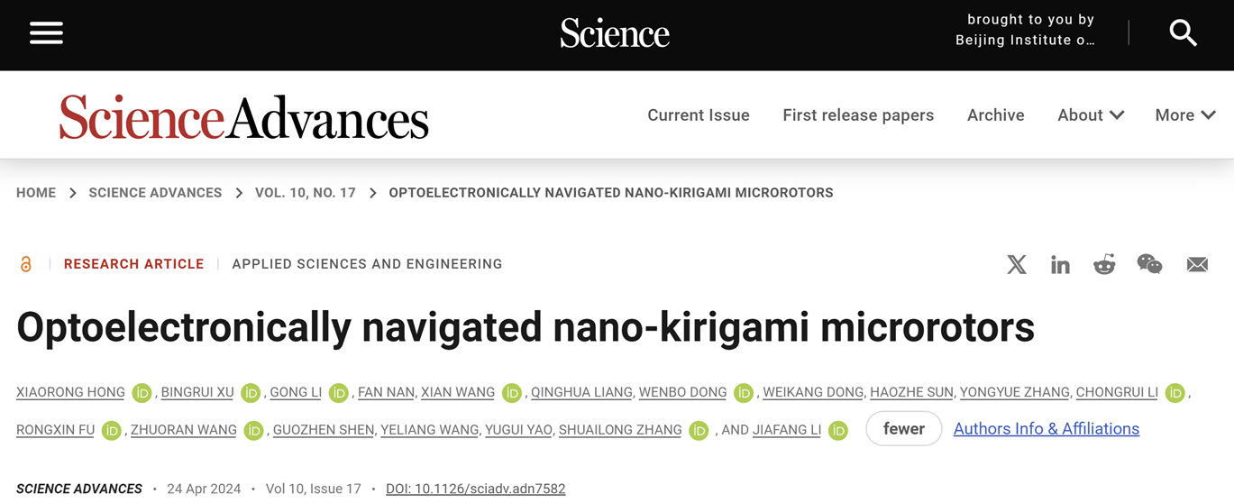 文章信息(#为共同一作;*为通讯作者):Xiaorong Hong#, Bingrui Xu#, Gong Li, Fan Nan, Xian Wang, Qinghua Liang, Wenbo Dong, Weikang Dong, Haozhe Sun, Yongyue Zhang, Chongrui Li, Rongxin Fu, Zhuoran Wang, Guozhen Shen, Yeliang Wang, Yugui Yao, Shuailong Zhang*, and Jiafang Li*. Optoelectronically navigated nano-kirigami microrotors. Science Advances, 10(17), adn7582 (2024).