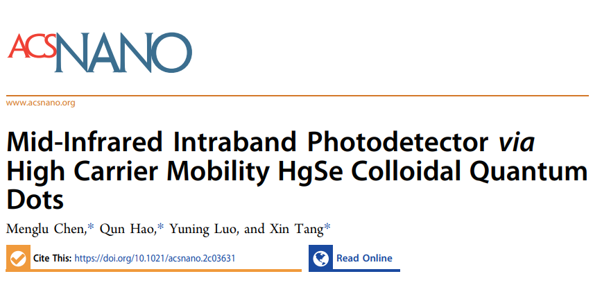 ob真人光电学院郝群教授团队成员陈梦璐准聘教授、唐鑫教授在《ACS NANO》期刊上发表了题为“Mid-Infrared Intraband Photodetector via High Carrier Mobility HgSe Colloidal Quantum Dots”的文章,利用低成本胶体量子点导带中1Se到1Pe的能级跃迁,实现低成本中波红外带内跃迁探测。