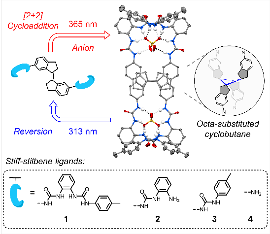 为解决上述问题,在前期建立的阴离子配位驱动组装合成策略( Acc. Chem. Res. 2022, 55 , 3218-3229; Angew. Chem. Int. Ed . 2023, 62 , e202314510; Angew. Chem. Int. Ed . 2024, 6 3 , e202406946)研究基础之上,吴彪教授团队首次利用刚性二苯乙烯(stiff-stilbene)的[2+2]环加成反应实现了一系列八取代环丁烷衍生物的高效合成。刚性二苯乙烯是一类明星光开关分子,得益于其差异性的几何结构、高效的异构化行为、合成易修饰的特点,在离子识别与传输、分子马达和超分子聚合物等领域应用广泛。然而,尚未有研究报道其能够发生[2+2]环加成反应。