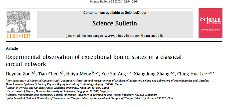 日前,ob真人物理学院张向东教授课题组和新加坡国立大学Ching Hua Lee等合作利用经典电路网络实现了奇异束缚态的实验观测。相关成果以“Experimental observation of exceptional bound states in a classical circuit network”为题发表在Science Bulletin期刊[Science Bulletin 69 (2024) 2194-2204]上。ob真人集成电路与电子学院博士后邹德源和物理学院陈天副教授为该论文共同第一作者,ob真人物理学院张向东教授、新加坡国立大学Ching Hua Lee、新加坡科技与设计大学Yee Sin Ang和湘潭大学孟海瑜为论文通讯作者。该研究工作得到了国家自然科学基金委的大力支持。