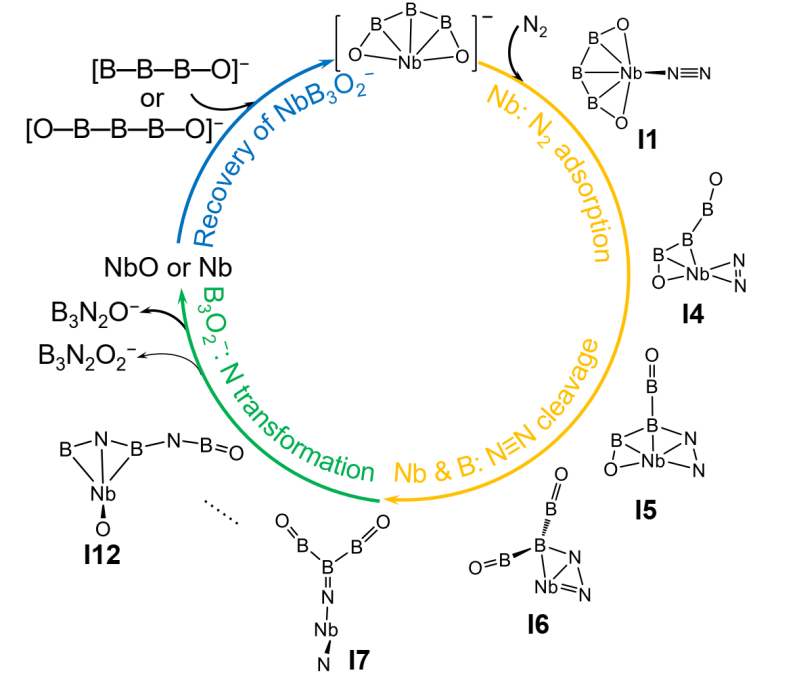 图1. NbB3O2−阴离子团簇催化转化N2循环示意图