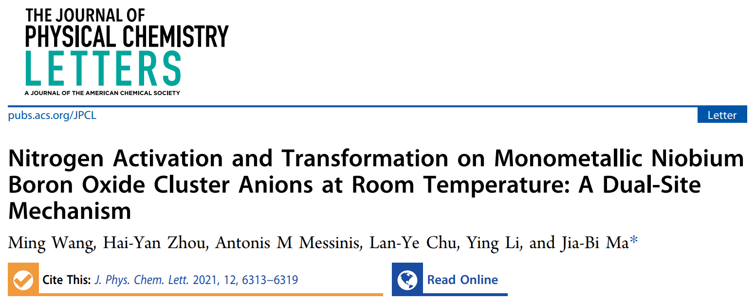 近日,ob真人化学与化工学院马嘉璧副教授团队通过质谱实验和高精度量子化学计算对N2与NbB3O2−气相团簇的反应性及团簇结构进行了深入研究,成功构造了具有双活性位点的、含单个前过渡金属原子的N2催化剂,实现了室温下对N2的活化转化,其活化模式是金属—配体活化(Metal-Ligand Activation,MLA)。相关成果以“Nitrogen Activation and Transformation on Monometallic Niobium Boron Oxide Cluster Anions at Room Temperature: A Dual-Site Mechanism”为题,发表在国际权威期刊《The Journal of Physical Chemistry Letters》(2021, 12, 6313-6319)。化学与化工学院博士生王明为该论文的第一作者,我校的马嘉璧副教授为论文的通讯作者。