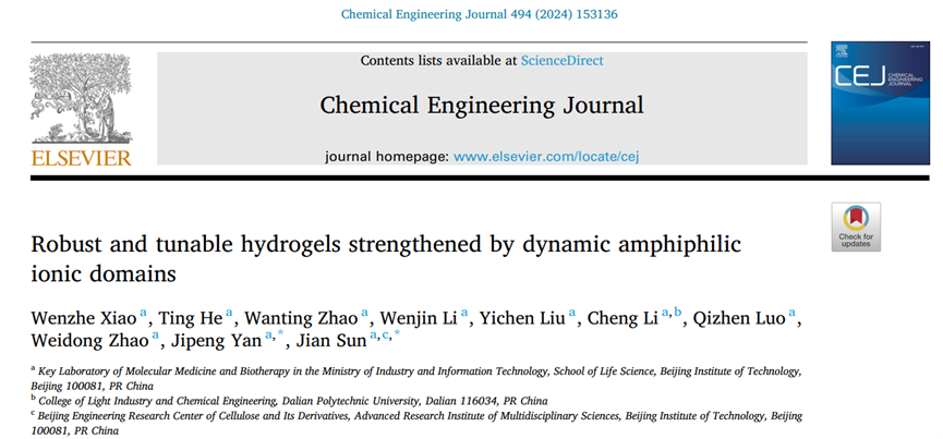 论文详情:Wenzhe Xiao, Ting He, Wanting Zhao, Wenjin Li, Yichen Liu, Cheng Li, Qizhen Luo, Weidong Zhao, Jipeng Yan,* Jian Sun*, Robust and tunable hydrogels strengthened by dynamic amphiphilic ionic domains. Chem. Eng. J. , 2024, 494, 153136.