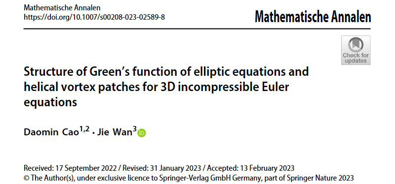 日前,ob真人数学与统计学院万捷副研究员在国际学术期刊《Mathematische Annalen》发表题为“Structure of Green’s function of elliptic equations and helical vortex patches for 3D incompressible Euler equations”的研究论文。该论文给出了散度型二阶椭圆算子Green函数的展开公式,并由此证明了无限管道区域上三维不可压缩欧拉方程集中到涡丝方程的螺旋对称涡补丁解的存在性和轨道稳定性。某种程度上给出了涡丝猜想在螺旋对称情形下的一个证明。